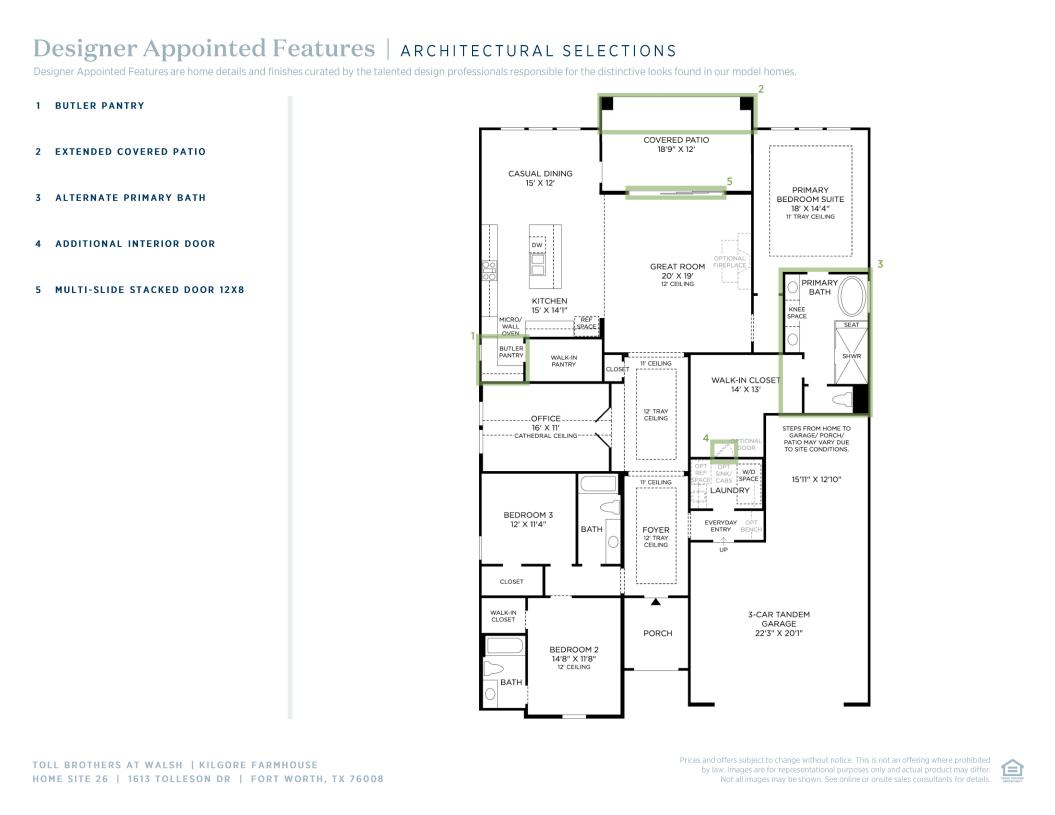 The Kilgore's welcoming porch and inviting extended foyer hallway with tray ceilings reveal the spacious great room and desirable covered patio beyond. The well-appointed kitchen overlooks a bright casual dining area, and is complete with a large center island with breakfast bar, plenty of counter and cabinet space, and huge walk-in pantry. The glorious primary bedroom suite is highlighted by a lovely tray ceiling, expansive walk-in closet, and deluxe primary bath with dual-sink vanity, large soaking tub, luxe shower, linen storage, and private water closet. Secondary bedrooms feature ample closets, one with private bath, the other with shared hall bath. Additional highlights include a versatile office, convenient everyday entry, centrally located laundry, and additional storage.