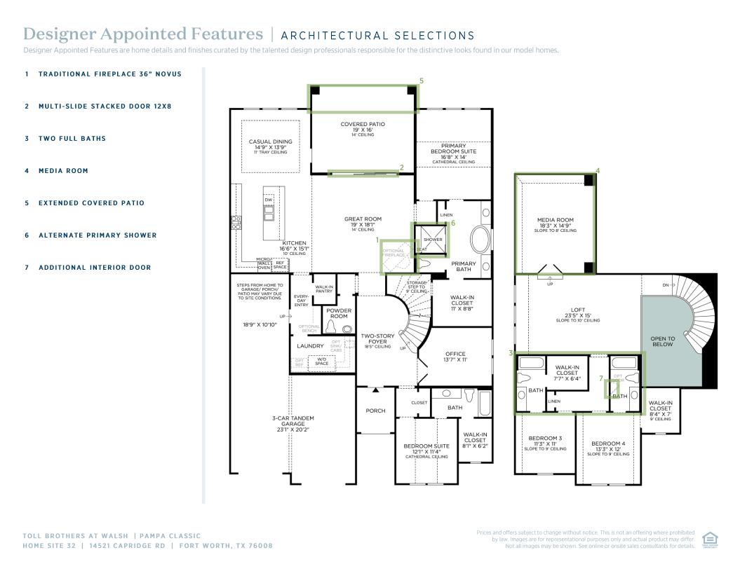 The Pampa epitomizes luxury within its expansive two-story floor plan. A stunning two-story foyer with elegant curved stairs flows seamlessly into the great room and a casual dining area with tray ceiling that offers views of the desirable covered patio beyond. The well-designed kitchen is highlighted by a large center island with breakfast bar, plenty of counter and cabinet space, and a sizable walk-in pantry. Secluded on the first floor, the marvelous primary bedroom suite is enhanced by a cathedral ceiling, a spacious walk-in closet, and a lush private bath complete with dual vanities, a freestanding tub, a luxe shower, and a private water closet. On the second level, two secondary bedrooms feature walk-in closets and a shared full bath and are central to a generous loft space. An additional bedroom suite with a walk-in closet and a private bath is conveniently located off the foyer. Also offered in the Pampa is a private office, convenient powder room and everyday entry, easily accessible laundry, and additional storage.