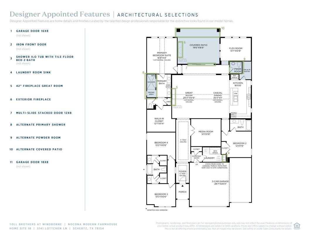 The Nocona blends comfort and elegance within its single-story floor plan. Upon entry, you're greeted by an extended foyer hallway with a tray ceiling that leads into the open-concept great room and casual dining area. Overlooking the main living area is the expertly designed kitchen, featuring a large island and walk-in pantry, perfect for culinary enthusiasts. A media room near the entry provides versatile space for relaxing and entertaining. The primary bedroom suite boasts a cathedral ceiling, an expansive walk-in closet, and a luxurious private bath with dual vanities, a spa-like shower, a freestanding tub, and a private water closet. Secondary bedrooms are sizable, two sharing a full bath and one sharing a hall bath. Additional highlights include a versatile flex room, easily accessible laundry, and a convenient everyday entry.