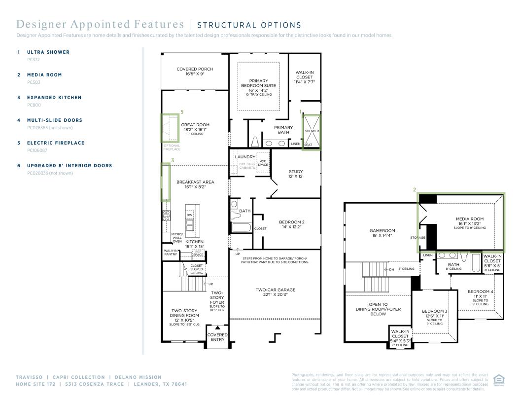 Urban deluxe style. The Delano's inviting covered entry and foyer open immediately to the bright two-story formal dining room, with views of the soaring great room and desirable covered porch beyond. The well-equipped kitchen overlooks a spacious casual dining area, and is complete with a large center island with breakfast bar, ample counter and cabinet space, and sizable walk-in pantry. The private primary bedroom suite is highlighted by a lovely tray ceiling, expansive walk-in closet, and spa-like primary bath with dual-sink vanity, luxe glass-enclosed shower, linen storage, and private water closet. Secluded on the second floor, secondary bedrooms are central to a generous flex room and feature walk-in closets and shared full hall bath with dual-sink vanity. Additional highlights include a desirable first-floor bedroom with closet and shared full hall bath; versatile office off the foyer; and centrally located laundry.