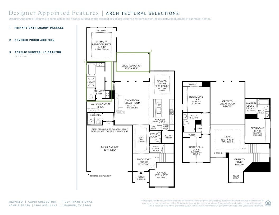 Luxurious by design. The Riley's welcoming covered entry and two-story foyer reveal the elegant turned stairs, and views of the two-story great room and desirable covered patio beyond. The well-equipped kitchen overlooks a bright casual dining area with tray ceiling, and is complete with a large center island with breakfast bar, ample counter and cabinet space, and roomy walk-in pantry. Secluded on the first floor, the private primary bedroom suite is enhanced by an elegant tray ceiling, king-size walk-in closet, and spa-like primary bath with dual vanities, large luxe glass-enclosed shower, and private water closet. Central to a generous flex room with tray ceiling, secondary bedrooms feature sizable closets, one with private full bath, the other with shared full hall bath. Additional highlights include a versatile office off the foyer, convenient powder room, centrally located laundry, and additional storage.