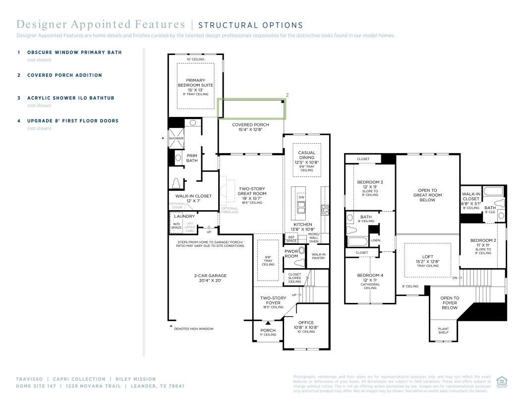 Luxurious by design. The Riley's welcoming covered entry and two-story foyer reveal the elegant turned stairs, and views of the two-story great room and desirable covered patio beyond. The well-equipped kitchen overlooks a bright casual dining area with tray ceiling, and is complete with a large center island with breakfast bar, ample counter and cabinet space, and roomy walk-in pantry. Secluded on the first floor, the private primary bedroom suite is enhanced by an elegant tray ceiling, king-size walk-in closet, and spa-like primary bath with dual vanities, large luxe glass-enclosed shower, and private water closet. Central to a generous flex room with tray ceiling, secondary bedrooms feature sizable closets, one with private full bath, the other with shared full hall bath. Additional highlights include a versatile office off the foyer, convenient powder room, centrally located laundry, and additional storage.