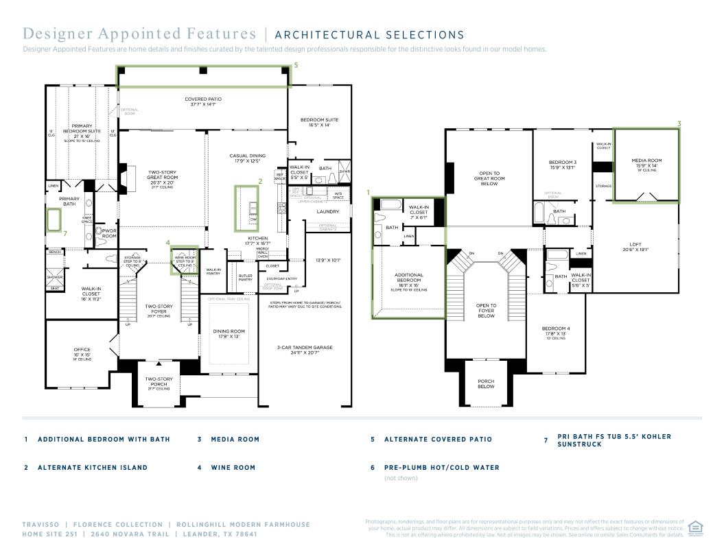 The Rollinghill showcases elegance with an impressive foyer that flows past the beautiful formal dining room, revealing flanking dual stairways that perfectly frame the spacious great room and a view to the extensive covered patio beyond. Central to an airy casual dining area, the expertly crafted kitchen features plenty of counter and cabinet space, a gorgeous center island with accompanying breakfast bar, a sizable walk-in pantry, and a butler pantry that connects to the dining room. Tucked away off the great room, the palatial primary bedroom suite is highlighted by an expansive walk-in closet and tranquil primary bath with dual vanities, large soaking tub, luxurious shower with seat and drying area, and a private water closet. Secondary bedrooms, one with a private bath and one with a shared hall bath, feature walk-in closets and overlook a spacious loft. Additionally featured in the Rollinghill is a desirable first-floor bedroom suite with walk-in closet and private bath, a private office off the foyer, convenient powder room and everyday entry, centrally located first-floor laundry, and additional storage.