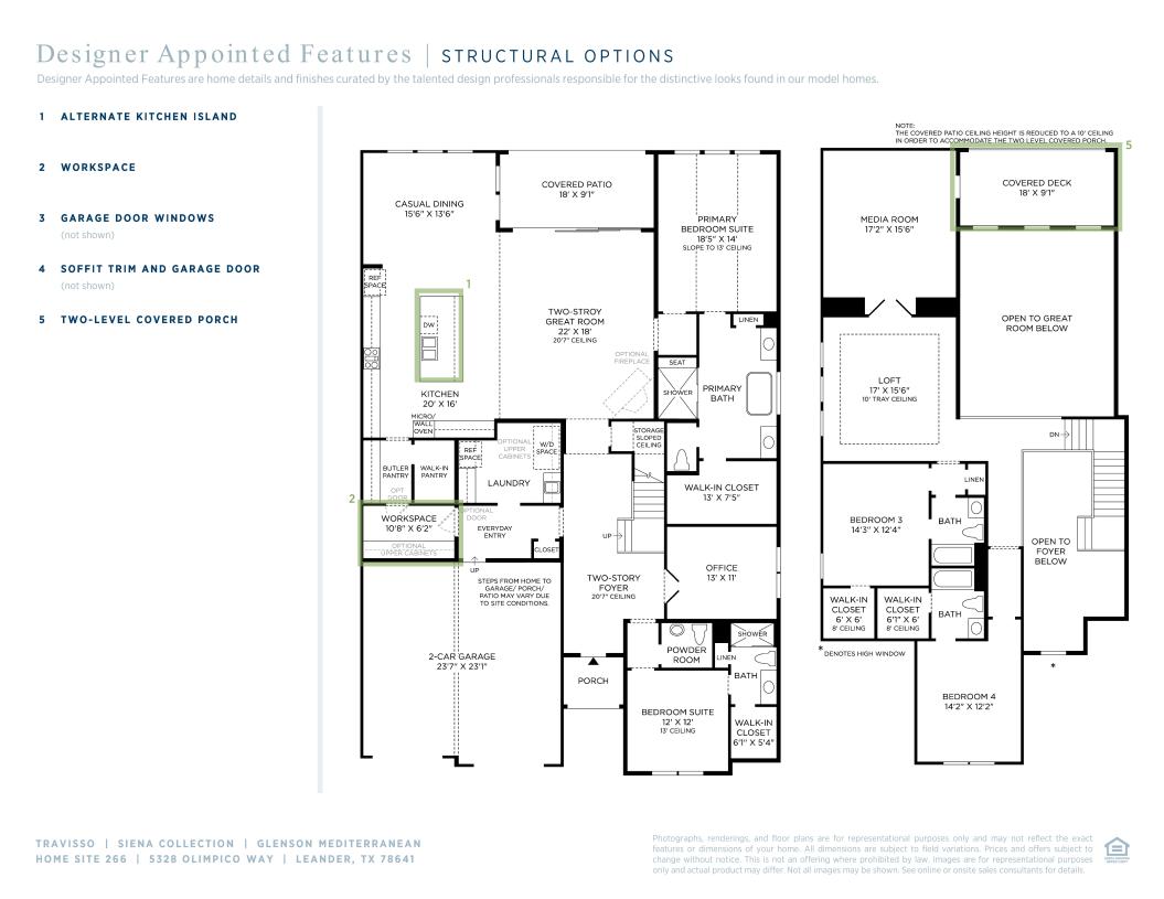 Elegantly appointed, the two-story foyer of the Glenson showcases the expansive two-story great room and rear covered patio. A beautiful casual dining area overlooks the expertly designed kitchen that is highlighted by an impressive center island with breakfast bar, wraparound counter and cabinet space, and an ample walk-in pantry. Tucked away off the great room, the serene primary bedroom suite is complemented by an appealing walk-in closet and an alluring primary bath featuring dual vanities, a luxurious shower with seat, large soaking tub, linen storage, and a private water closet. The first floor is enhanced by a desirable first-floor bedroom with walk-in closet and private bath as well as a spacious office off the foyer. Secondary bedrooms, one with a private bath and one with a shared hall bath, feature walk-in closets and can be found central to a generous loft with adjacent media room. Additional highlights include a convenient powder room and everyday entry, easily accessible laundry, and ample additional storage.