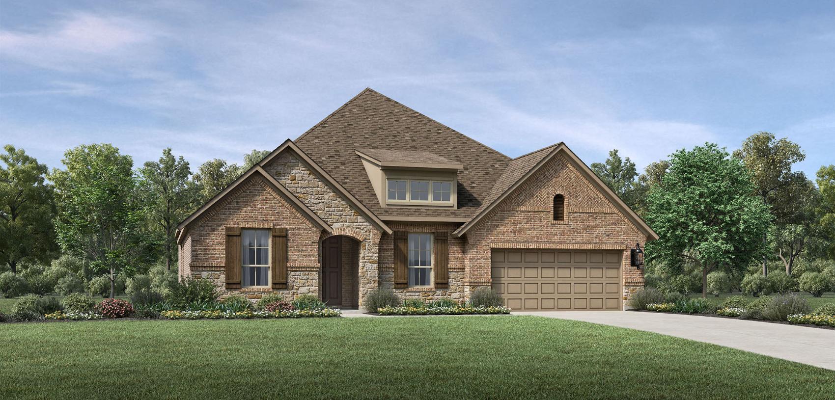 An impressive extended foyer with tray ceilings reveals the Halsell's beautiful dining room, opening to the spacious great room, casual dining area, and desirable rear covered patio. Enhancing the well-appointed kitchen are a large center island with breakfast bar, plenty of counter and cabinet space, and generous walk-in pantry. The stunning primary bedroom suite is complete with a lovely tray ceiling, walk-in closet, and luxurious primary bath with dual vanities, luxe shower, linen storage, and private water closet. Secondary bedrooms feature ample closets, one with private bath, the other with shared hall bath. Additional highlights include a convenient everyday entry, centrally located laundry, and additional storage.