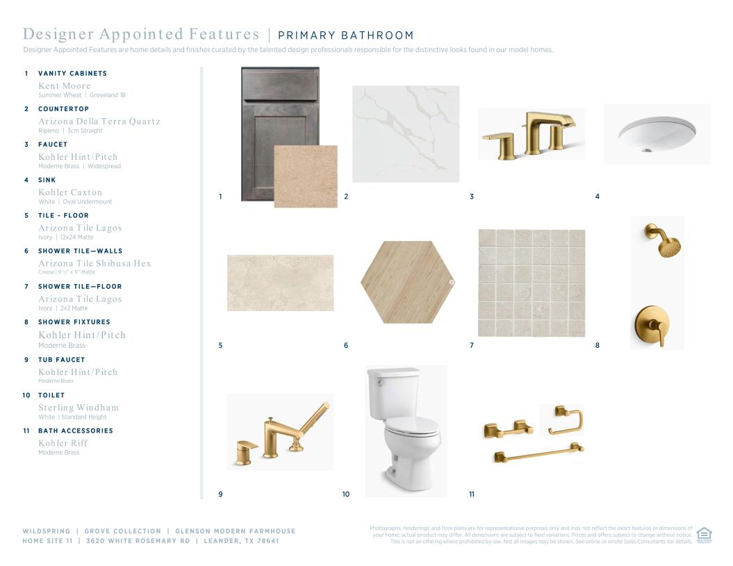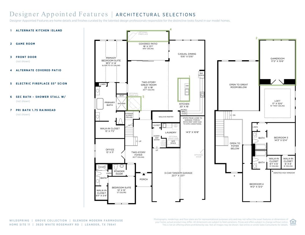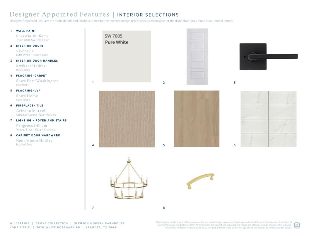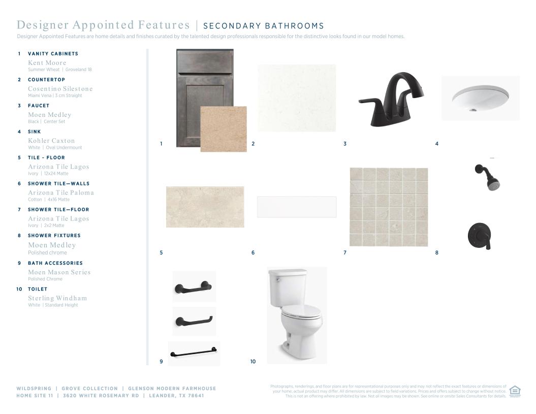 Elegantly appointed, the two-story foyer of the Glenson showcases the expansive two-story great room and rear covered patio. A beautiful casual dining area overlooks the expertly designed kitchen that is highlighted by an impressive center island with breakfast bar, wraparound counter and cabinet space, and an ample walk-in pantry. Tucked away off the great room, the serene primary bedroom suite is complemented by an appealing walk-in closet and an alluring primary bath featuring dual vanities, a luxurious shower with seat, large soaking tub, linen storage, and a private water closet. The first floor is enhanced by a desirable first-floor bedroom with walk-in closet and private bath as well as a spacious office off the foyer. Secondary bedrooms, one with a private bath and one with a shared hall bath, feature walk-in closets and can be found central to a generous loft with adjacent media room. Additional highlights include a convenient powder room and everyday entry, easily accessible laundry, and ample additional storage.