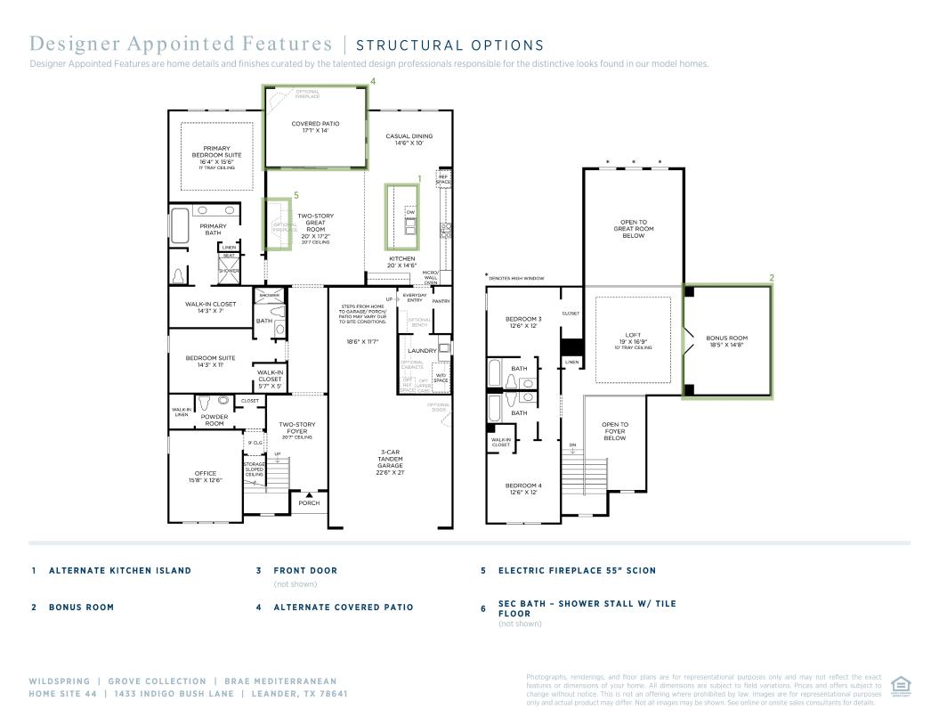 The perfect balance of lovely living spaces and quiet corners, the Brae is breathtaking. A soaring two-story foyer and hallway reveal the Brae's impressive two-story great room with covered patio, overlooked by the well-appointed kitchen offering a bright casual dining area, large center island with breakfast bar, plenty of counter and cabinet space, and sizable pantry. The secluded primary bedroom suite is complete with an ample walk-in closet and spa-like primary bath with a dual-sink vanity, a large soaking tub, a luxe shower with seat, linen storage, and a private water closet. Secondary bedrooms feature large closets and private baths, and are central to a generous loft with tray ceiling. Additional highlights include a versatile first-floor bedroom with closet and private bath, a spacious office, a centrally located laundry, a convenient powder room and everyday entry, and additional storage throughout.