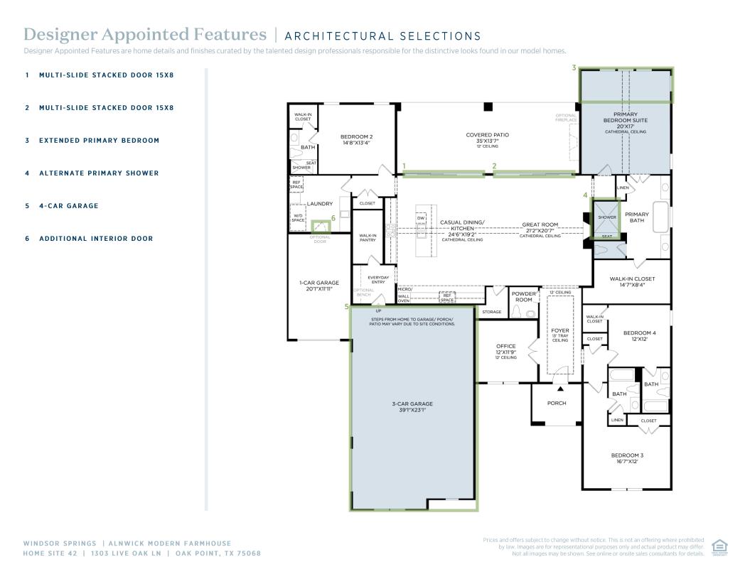 The Alnwick offers exemplary single-level luxury living with beautiful gathering spaces, quiet escapes, and impeccable architecture. An elegant foyer with tray ceiling frames a breathtaking view of the expansive open-concept great room, the casual dining area with cathedral ceiling, and the spacious covered patio beyond. Adjacent, the well-designed kitchen is highlighted by a large center island with breakfast bar, plenty of counter and cabinet space, and a sizable walk-in pantry. The palatial primary bedroom suite is complemented by a soaring cathedral ceiling, an ample walk-in closet, and a majestic primary bath with dual vanities, a serene soaking tub, a luxe shower with seat, and a private water closet. Secondary bedrooms, two with walk-in closets, one with a roomy closet, feature private baths. Additional highlights include a generous office off the foyer, conveniently located laundry, a powder room, an everyday entry, and ample additional storage.