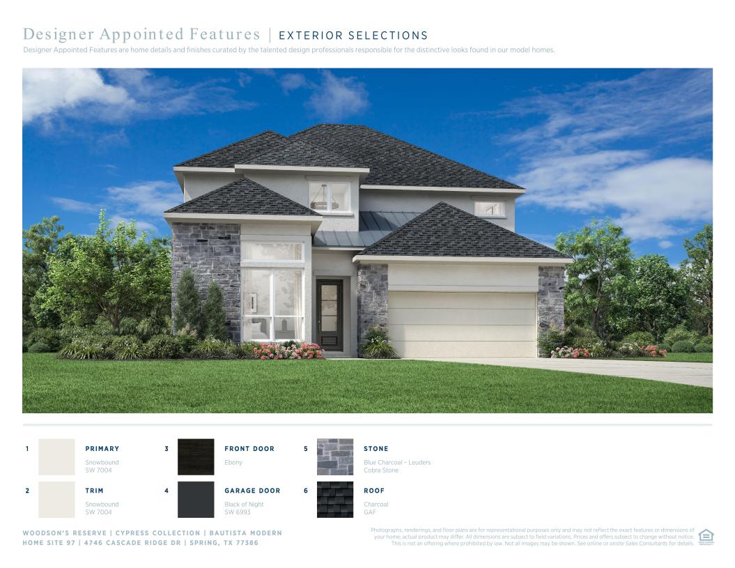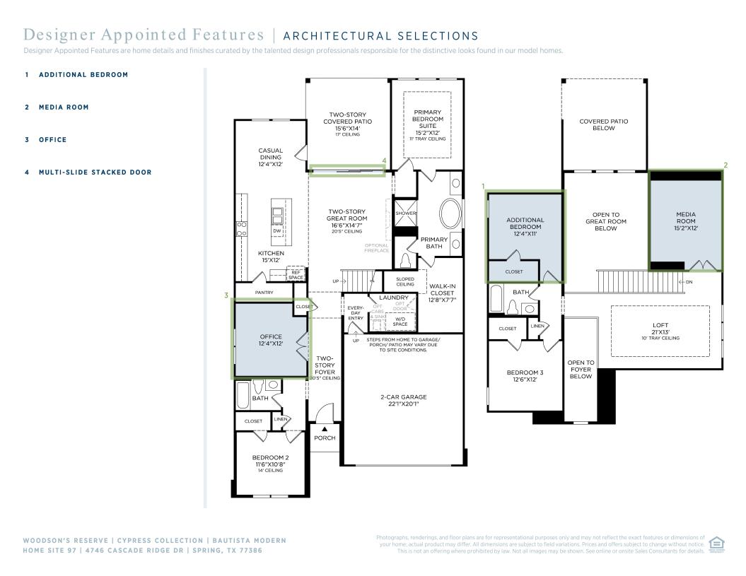 The soaring two-story foyer of the Bautista makes an immediate impression as it extends into the expansive two-story great room with access to the rear covered patio and views of a intimate casual dining area. A large center island with breakfast bar defines the well-appointed kitchen, offering plenty of counter and cabinet space as well as an ample walk-in pantry. The charming primary bedroom suite is highlighted by a gorgeous tray ceiling, generous walk-in closet, and a beautiful primary bath complete with dual vanities, large soaking tub, deluxe shower, and a private water closet. The secondary bedroom is conveniently located off the foyer, featuring a walk-in closet and a shared hall bath. Secluded on the second floor, an additional bedroom with a walk-in closet and shared hall bath overlooks a spacious loft with tray ceiling. Additional highlights include a large flex room on the first floor, centrally located laundry, convenient everyday entry, and ample additional storage.