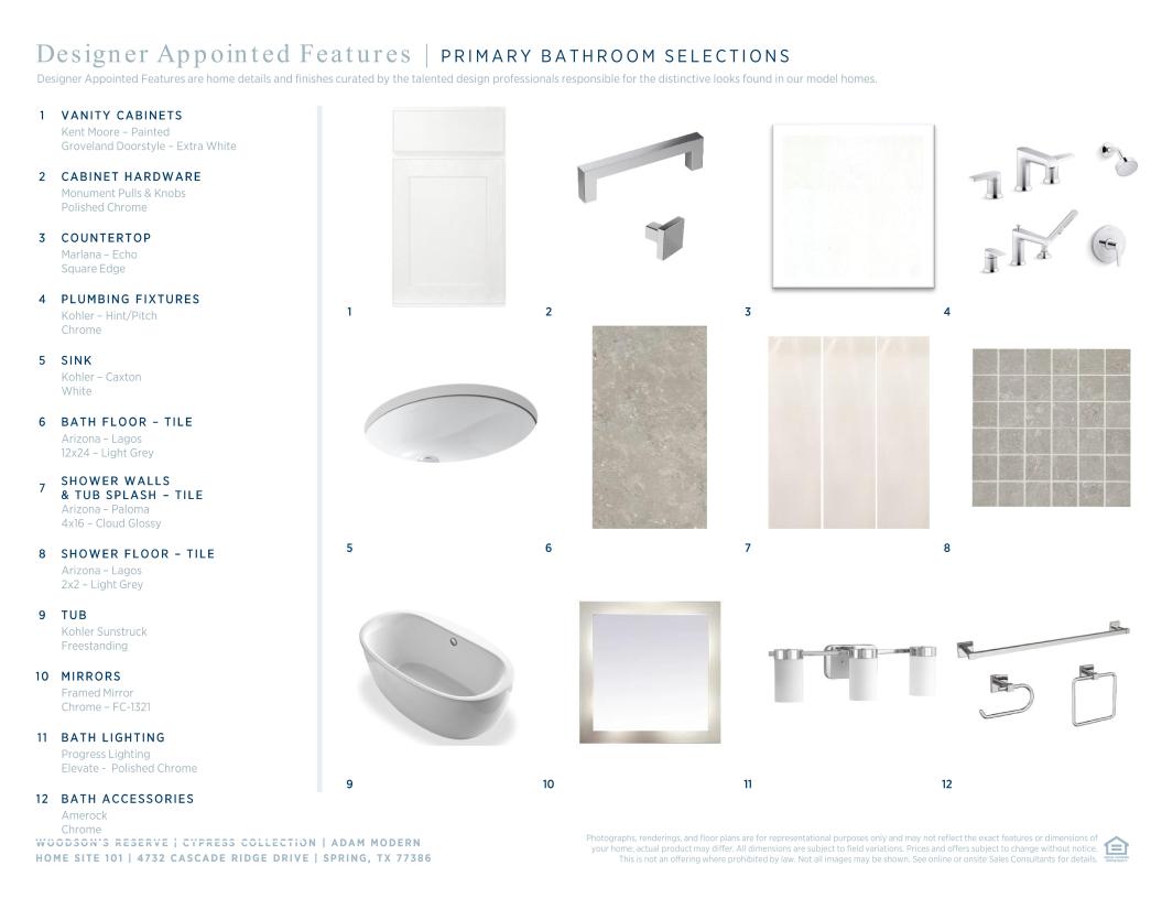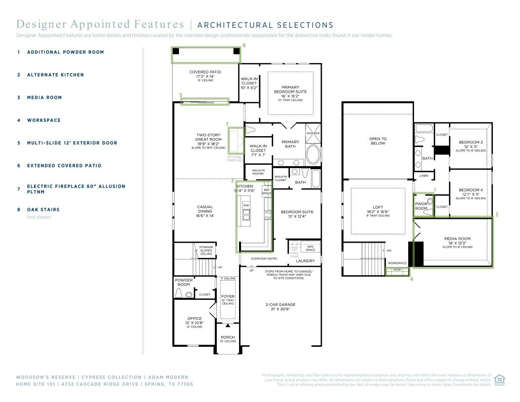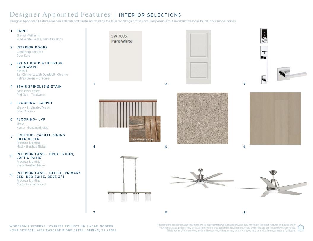 Modern deluxe touches. The Adam's inviting covered porch entry and welcoming foyer with tray ceiling offer views to the bright casual dining area, soaring two-story great room, and desirable covered patio beyond. The well-designed gourmet kitchen is enhanced by a large center island with breakfast bar, plenty of counter and cabinet space, and sizable walk-in pantry. The serene primary bedroom suite is highlighted by a lovely tray ceiling, dual walk-in closets, and deluxe primary bath with dual-sink vanity, large soaking tub, luxe shower, and private water closet. Central to a generous loft with tray ceiling, secondary bedrooms feature ample closets and shared hall bath with separate dual-sink vanity area. Additional highlights include a desirable first floor bedroom suite with walk-in closet and private bath, versatile office, convenient powder room and everyday entry, centrally located laundry, and additional storage.