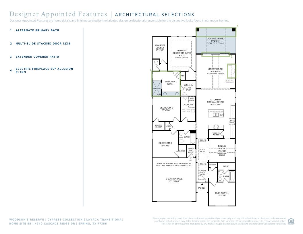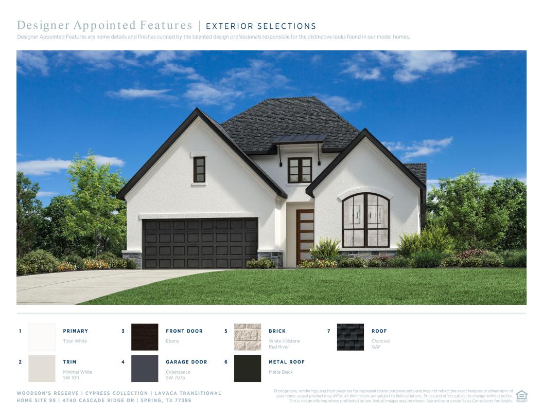 The Lavaca's welcoming porch and inviting foyer hallway with tray ceilings open onto the elegant formal dining room, offering views to the expansive great room and desirable covered patio. The well-appointed kitchen overlooks a bright casual dining area, and is complete with a large center island with breakfast bar, plenty of counter and cabinet space, and enormous walk-in pantry. The impressive primary bedroom suite is enhanced by a gorgeous cathedral ceiling, dual walk-in closets, and deluxe primary bath with dual-sink vanity, large soaking tub, luxe shower with seat, and private water closet. Secondary bedrooms feature sizable closets, one with private bath, two with shared hall bath. Additional highlights include a convenient everyday entry, centrally located laundry, and additional storage.