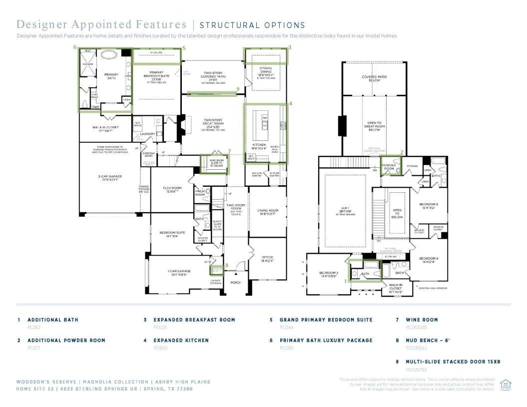 The Ashby offers an upgraded, luxurious living experience. Its inviting covered entry, featuring a pivot iron front door, leads into the grand two-story foyer and dining room, flowing seamlessly into the expansive two-story great room with views of the expanded covered porch and a desirable 15x8 Multi Slide Stacked Door (Black) connecting to the outdoor space. The thoughtfully designed gourmet kitchen is expanded to include more counter and cabinet space, a large center island with a breakfast bar, a massive walk-in pantry, and a Butler's Pantry, offering ample space for preparing and serving meals. The breakfast room is also expanded, allowing for a bright and airy casual dining experience. The private primary bedroom suite is grand, with a tray ceiling and ample space, while the deluxe primary bath is enhanced with a luxury package, including dual vanities, a large soaking tub, a luxe shower with seating, and a private water closet. A grand walk-in closet completes this luxurious suite. Upstairs, the large loft is central to three secondary bedrooms, each with walk-in closets. Two bedrooms share a bath with separate vanity areas, while the third features easy access to a shared hall bath. The home also features an additional bath and powder room for added convenience. Additional highlights include a wine room for wine enthusiasts, a Mud Bench (6 feet) by the everyday entry for easy organization, and abundant storage throughout the home. A desirable first-floor bedroom suite with its own private bath, a spacious flex room, and a versatile office complete the space, offering flexibility for any lifestyle.