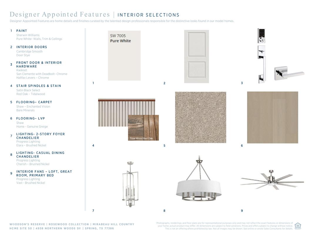 The Mirabeau's welcoming covered porch and stunning two-story foyer open onto the soaring two-story great room and desirable covered patio beyond. The well-appointed kitchen overlooks a bright casual dining area, and is highlighted by a large center island with breakfast bar, plenty of counter and cabinet space, and ample pantry. The majestic primary bedroom suite is enhanced by a beautiful tray ceiling, gigantic walk-in closet, and deluxe primary bath with dual-sink vanity, large soaking tub, luxe shower with seat, linen storage, and private water closet. Central to a generous flex room, secondary bedrooms feature roomy closets and shared full hall bath with separate dual-sink vanity area. Additional highlights include a versatile office off the foyer, convenient powder room and everyday entry, centrally located laundry, and additional storage.