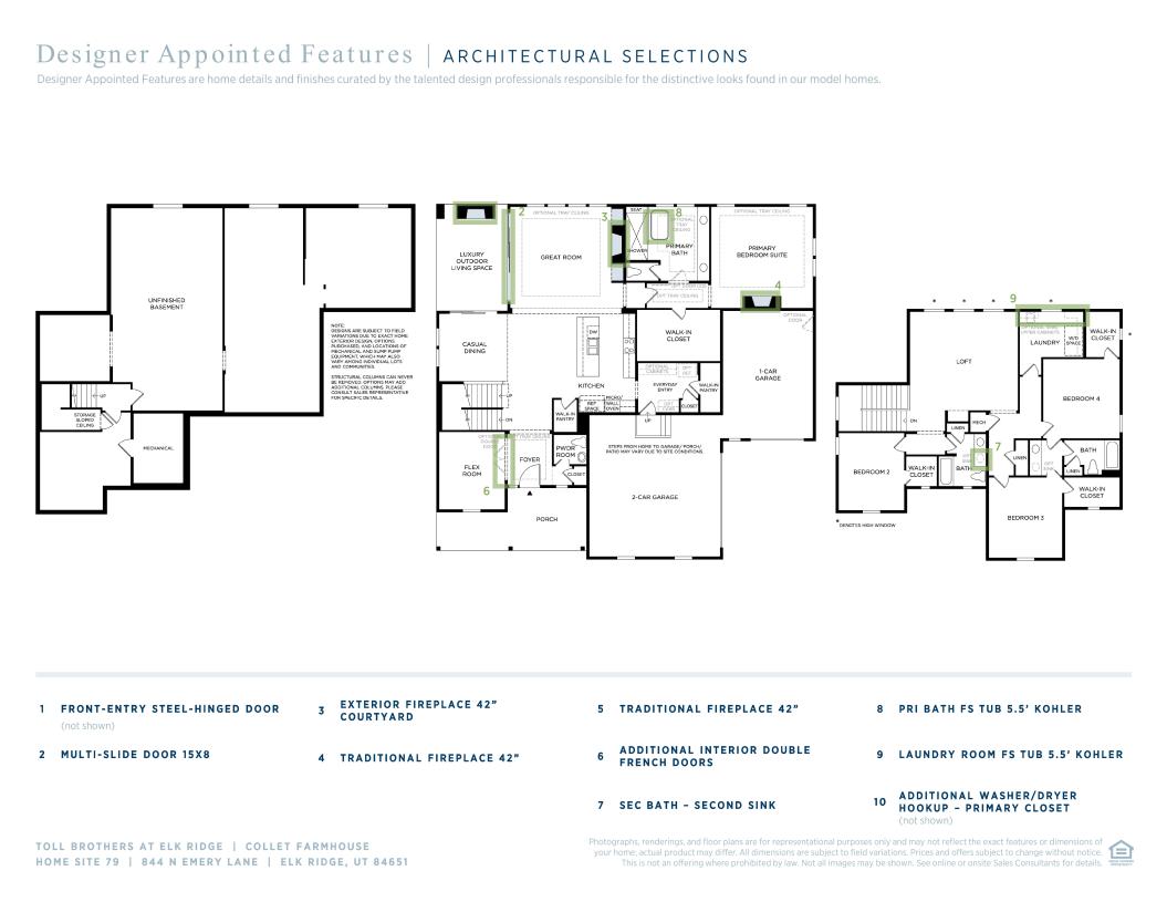 Deluxe touches for modern living. The Collet's inviting stepped covered entry flows into the welcoming foyer, opening immediately onto a bright flex space with views of the spacious dining room, great room, and luxury outdoor living space beyond. The well-designed kitchen overlooks the great room and dining room, and is equipped with a large center island with lowered breakfast bar top, ample counter and cabinet space, and generous walk-in pantry. The private first floor primary bedroom suite is enhanced by an elevated ceiling, huge walk-in closet, and deluxe primary bath with dual-sink vanity, large soaking tub, luxe large shower, and private water closet. Central to a sizable loft, secondary bedrooms feature walk-in closets, two with shared full hall bath, one with private full bath. Additional highlights include a convenient powder room and everyday entry, centrally located laundry, and additional storage.