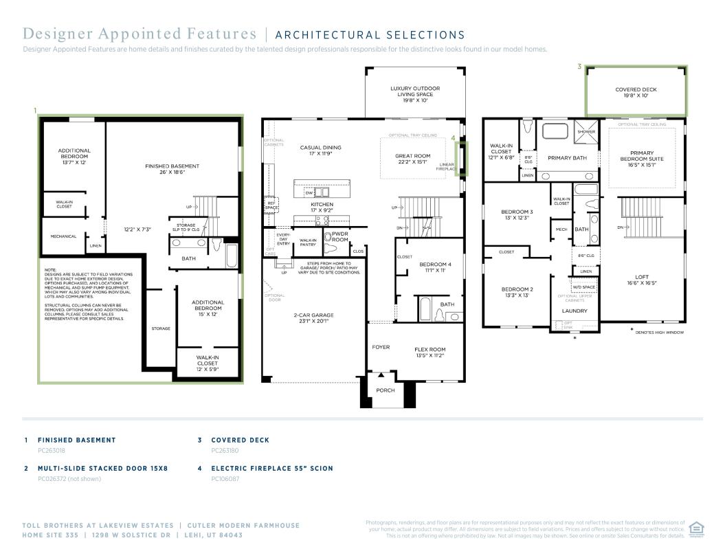 The Cutler's inviting covered entry and foyer open immediately onto the bright flex space, revealing views of the spacious great room, casual dining area, and desirable luxury outdoor living space beyond. The well-designed kitchen is equipped with a large center island with a breakfast bar, plenty of counter and cabinet space, and a sizable walk-in pantry. On the second floor, the marvelous primary bedroom suite is complete with a gigantic walk-in closet and deluxe primary bath with dual-sink vanity, large soaking tub, luxe glass-enclosed shower, linen storage, and private water closet. Central to a generous loft, secondary bedrooms feature ample closets and a shared full hall bath with a separate dual-sink vanity area. Additional highlights include a desirable first-floor guest bedroom suite with a roomy closet and private full bath, a convenient powder room, a centrally located second-floor laundry, and additional storage throughout. A versatile, fully finished basement offers endless possibilities for additional bedrooms and an entertaining space.