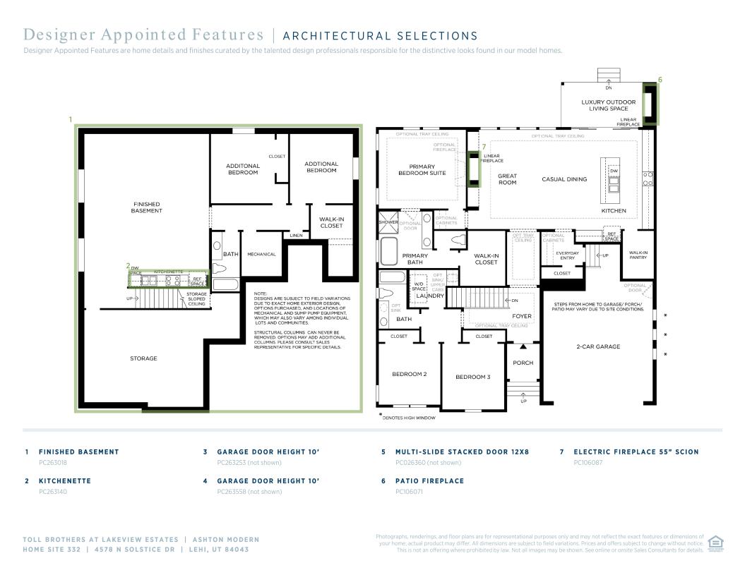 The Ashton's welcoming, stepped, covered entry flows into the inviting foyer, revealing views of the spacious great room, dining room, and desirable luxury outdoor living space beyond, with expansive sliding doors opening the home up to a large rear covered patio for seamless indoor-outdoor living space. The well-designed kitchen is equipped with a large center island with a breakfast bar, plenty of counter and cabinet space, and a sizable walk-in pantry. The bright primary bedroom suite is enhanced by a generous walk-in closet and deluxe primary bath with dual-sink vanity, large soaking tub, luxe glass-enclosed shower, and private water closet. Spacious secondary bedrooms feature ample closets and a shared full hall bath. The thoughtfully finished basement features a kitchenette and additional bedrooms—the perfect environment to enjoy with the family and for entertaining. Additional highlights include a centrally located laundry and additional storage throughout.