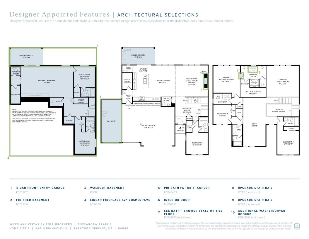 The Tuscarora features beautiful soaring spaces and sophisticated architecture. An elegant two-story foyer and airy great room are central to the bright main living space. A casual dining area and expansive luxury outdoor living space overlook the well-designed kitchen, offering a large center island with a breakfast bar, plenty of counter and cabinet space, and a generous walk-in pantry. Enhancing the superb primary bedroom suite is a spacious walk-in closet and a regal primary bath with dual vanities, a large soaking tub, a luxe shower with a seat, and a private water closet. Two of the secondary bedrooms feature sizable closets and a shared hall bath, while another features a walk-in closet and a private bath. Additional highlights include an expansive unfinished basement, an ample loft, a desirable first-floor bedroom with a walk-in closet and private bath, conveniently located second-floor laundry, a powder room, an everyday entry, and plenty of additional storage.