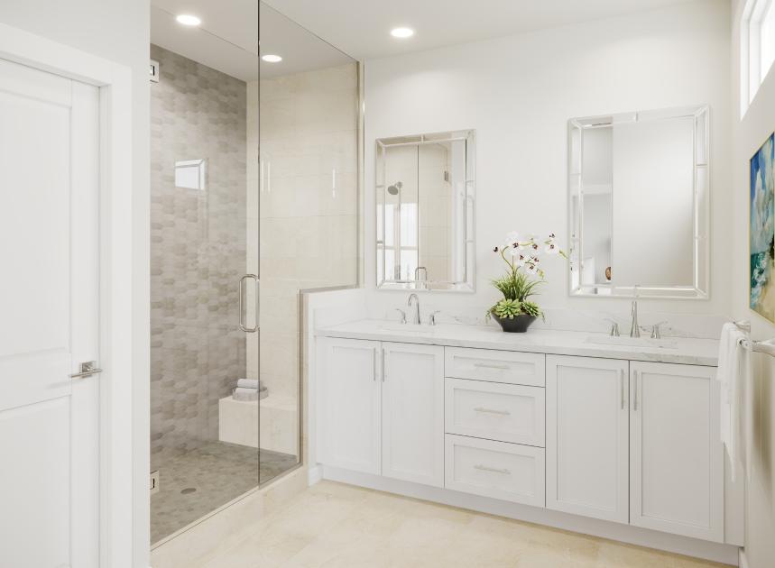 • Primary suite features dual-sink vanity and shower with built-in seat