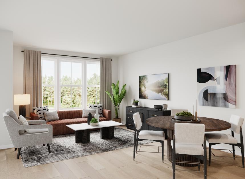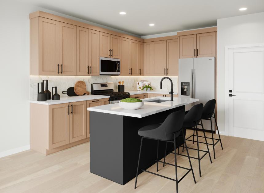 The Sitka offers a comfortable, functional layout across two thoughtfully designed levels. A welcoming foyer leads into an open-concept great room and kitchen, ideal for entertaining and everyday living. The kitchen features a center island, L-shaped counter, and a convenient pantry, with a nearby powder room adding ease to the main floor. Upstairs, the private primary suite includes a spacious walk-in closet and a well-appointed bath with a dual-sink vanity, a shower with seat, and a private water closet. A covered deck off the suite creates a serene outdoor retreat. Two secondary bedrooms share a full hall bath, while a centrally located laundry room adds convenience to the upper level.