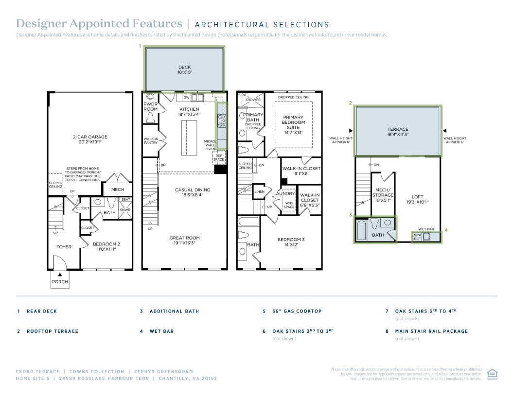 The Zephyr offers a sleek multi-level layout that balances style and everyday convenience. The entry-level features a secondary bedroom with a private bath and shower with seat—ideal for guests or extended stays. On the second floor, the open-concept great room flows effortlessly into the casual dining area and kitchen, which includes a center island, L-shaped counters, and a walk-in pantry. A nearby powder room adds function to the main living space. The third-floor primary suite features a dropped ceiling, generous walk-in closet, and a spa-inspired bath with a dual-sink vanity, shower with seat, and private water closet. An additional secondary bedroom with a private bath and walk-in closet adds comfort and privacy. A central laundry room completes the third level. The fourth-floor loft with powder room and storage offers flexible space for work, play, or entertaining.