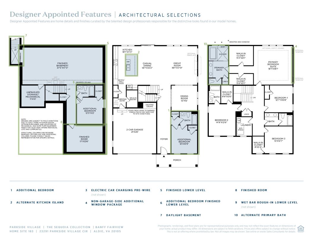This stunning Banff home design offers sophisticated spaces for stylish and comfortable living. A welcoming foyer flows past a flex room and bright dining room into the spacious great room and casual dining area with sliding door access to the rear yard. The well-appointed kitchen is complete with a generous center island with breakfast bar seating, ample cabinet space, and a walk-in pantry. A true retreat, the primary bedroom features dual walk-in closets and a serene primary bath with dual vanities, a luxe shower with seat, linen storage, and a private water closet. Two secondary bedrooms, one with a walk-in closet, share a full hall bath with a separate vanity area. An additional secondary bedroom offers a private bath and a walk-in closet. Additional highlights include an everyday entry, a powder room, bedroom-level laundry, and extra storage throughout.