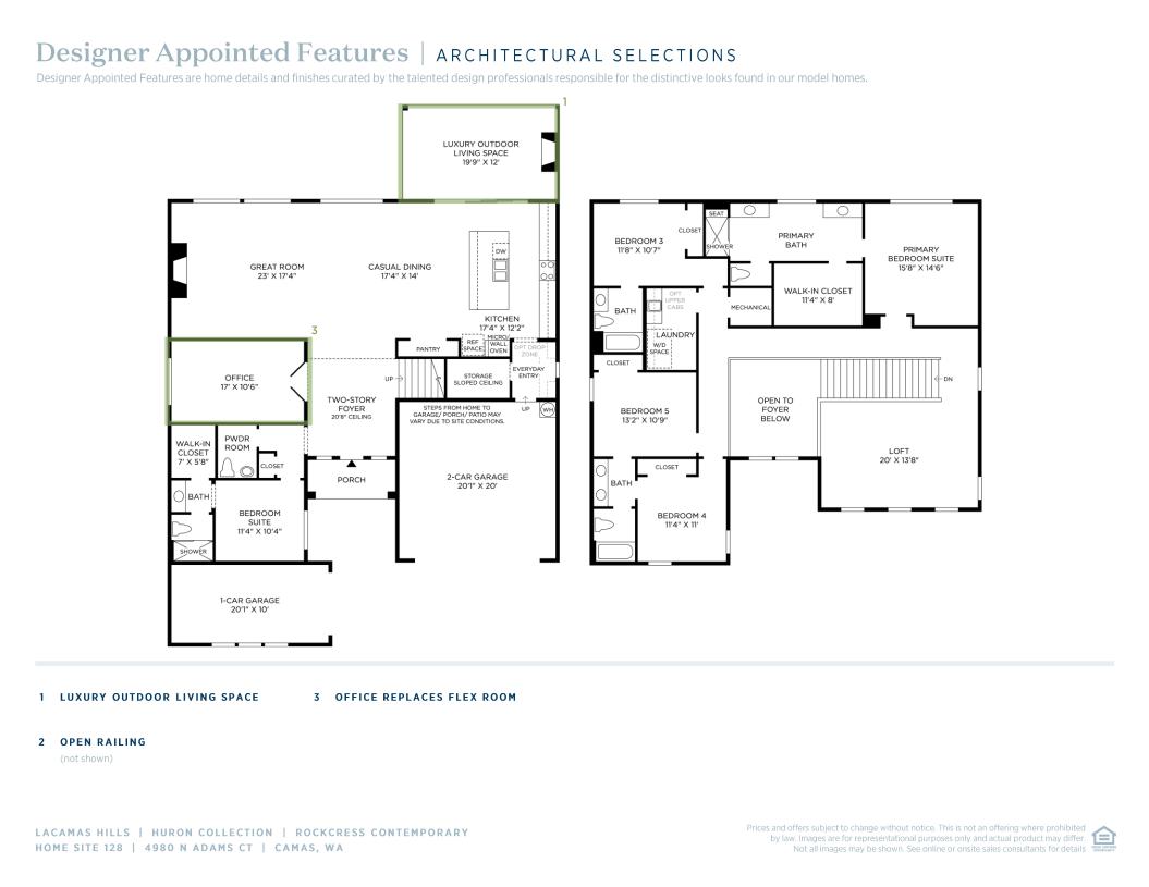 The Rockcress' inviting stepped covered porch and stunning two-story foyer open onto a bright flex room, and views to the spacious great room, casual dining area, and desirable covered patio beyond. The well-designed kitchen is complete with a large center island with breakfast bar, plenty of counter and cabinet space, and generous walk-in pantry. The marvelous primary bedroom suite is enhanced by a walk-in closet and luxe primary bath with separate vanities, large soaking tub, walk-in shower with seat, and private water closet. Central to an enormous loft, secondary bedrooms feature ample closets, one with private bath, two with shared bath with separate dual-sink vanity area. Additional highlights include a bedroom suite with walk-in closet and private bath off the foyer, convenient powder room and everyday entry, centrally located laundry, and additional storage.
