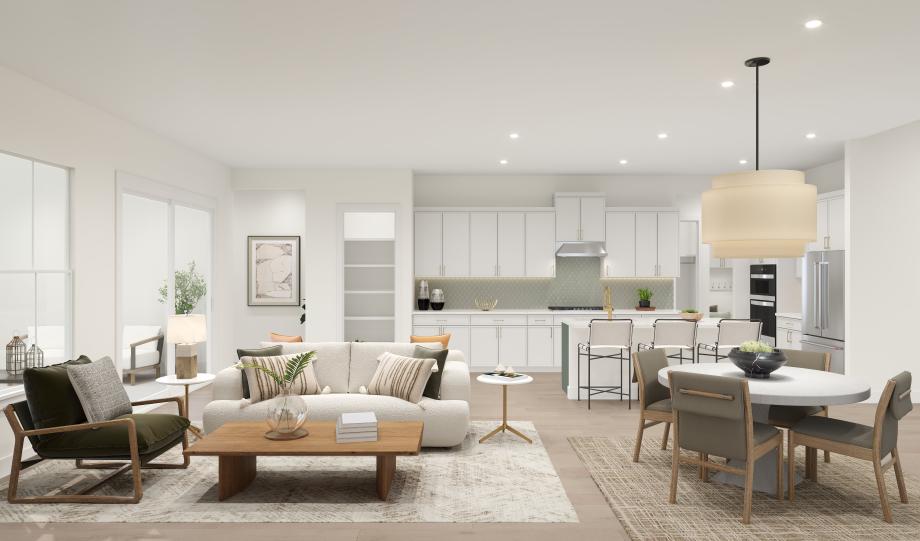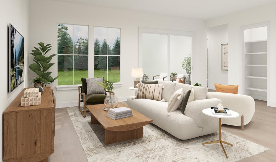 The Estelle balances comfort and style in a thoughtfully designed single-story layout. A foyer leads to the great room, kitchen, and casual dining area—perfect for everyday living and effortless entertaining. The kitchen includes a central island with breakfast bar and a pantry, while a patio just off the great room with multi-stacking door extends the living space outdoors, complete with fireplace. The private primary suite features a generous walk-in closet and a spa-like bath with a dual sink vanity, a luxe shower, and a private water closet. Two secondary bedrooms share a full hall bath. Additional highlights include an everyday entry, laundry area, and built-in storage throughout.