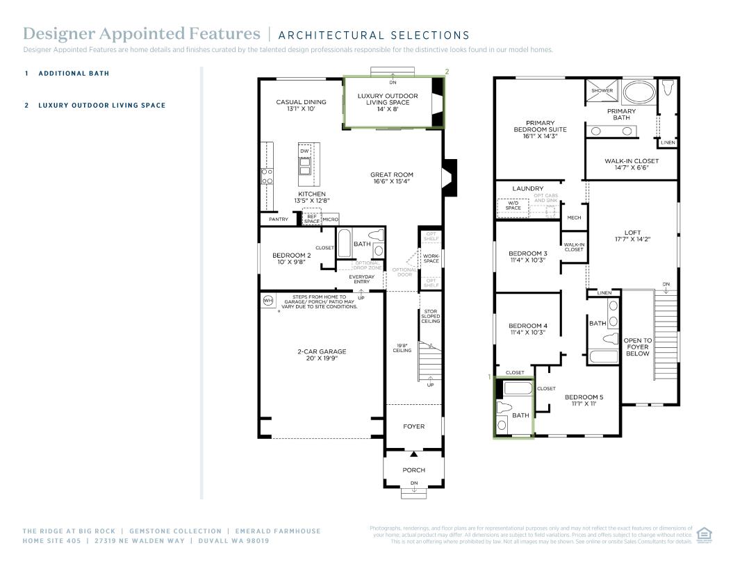 The Emerald's welcoming entry and inviting foyer opens onto the spacious great room and casual dining area, with views to the desirable luxury outdoor living space beyond. The well-designed kitchen is complete with a large center island with a breakfast bar, plenty of counter and cabinet space, and a pantry. The lovely primary bedroom suite is enhanced by an enormous walk-in closet and spa-like primary bath with dual-sink vanity, large luxe shower, linen storage, and private water closet. The generous secondary bedroom features a walk-in closet and a private bath. Additional highlights include a main-floor bedroom and workspace, convenient powder room, centrally located laundry, and additional storage.