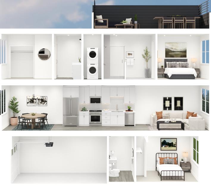 The Cascadian is a testament to luxury living, showcasing a well-designed four-story floor plan. An inviting foyer on the first level leads up to the open-concept main living space on the second floor, featuring a beautifully appointed kitchen with a walk-in pantry, seamlessly connecting to a great room and casual dining area. Flat-panel white kitchen cabinetry with a modern backsplash and sophisticated polished nickel edge pulls gives the home a contemporary feel. The elegant primary bedroom suite highlights the third floor, boasting a sizable walk-in closet and a serene private bathroom with a glass-enclosed shower, a dual-sink vanity, and a private water closet. Secondary bedrooms, one on the third floor and one on the first floor, each offer a private bath and spacious closets. On the fourth floor, discover a stunning rooftop terrace that provides an ideal setting for social gatherings or quiet evenings of relaxation. Also offered in the Cascadian are a convenient everyday entry on the first floor, bedroom-level laundry, a powder room on the main living level, and ample storage space.
